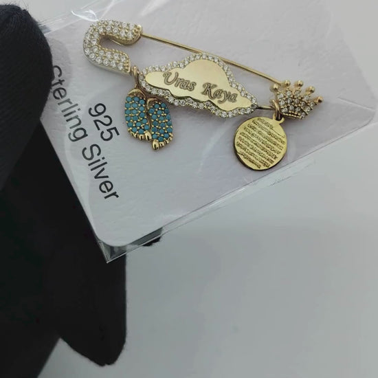 Erkek Bebek 925 Ayar Gümüş Ayetel Kürsi Dualı Isimli Yaka Iğnesi, Maşallah Bebek Iğnesi