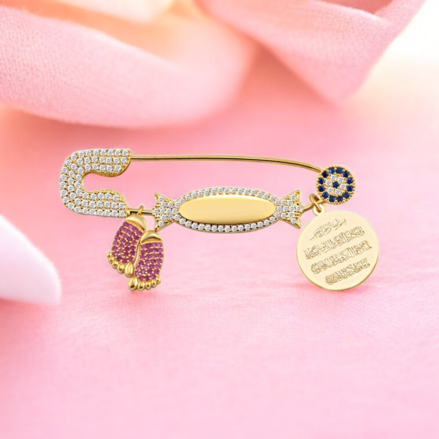 - Ayet-el kürsi dualı bebek iğnesi, manevi koruma sağlamak amacıyla ayet-el kürsi duası ve nazar boncuğu detaylarına sahiptir.