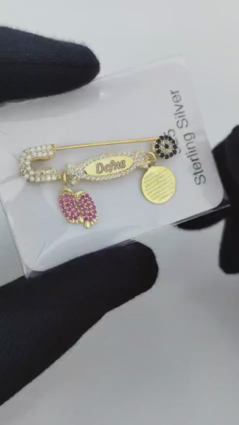 Kız Bebek 925 Ayar Gümüş Ayetel Kürsi Dualı İsimli Yaka İğnesi, Maşallah Bebek İğnesi Altın Kaplama